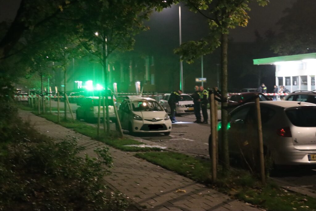 Op de parkeerplaat staat een kleine witte auto. De impact van de klap is groot geweest, de auto is helemaal ontzet. Er zijn zover bekend geen gewonden gevallen bij dit incident.