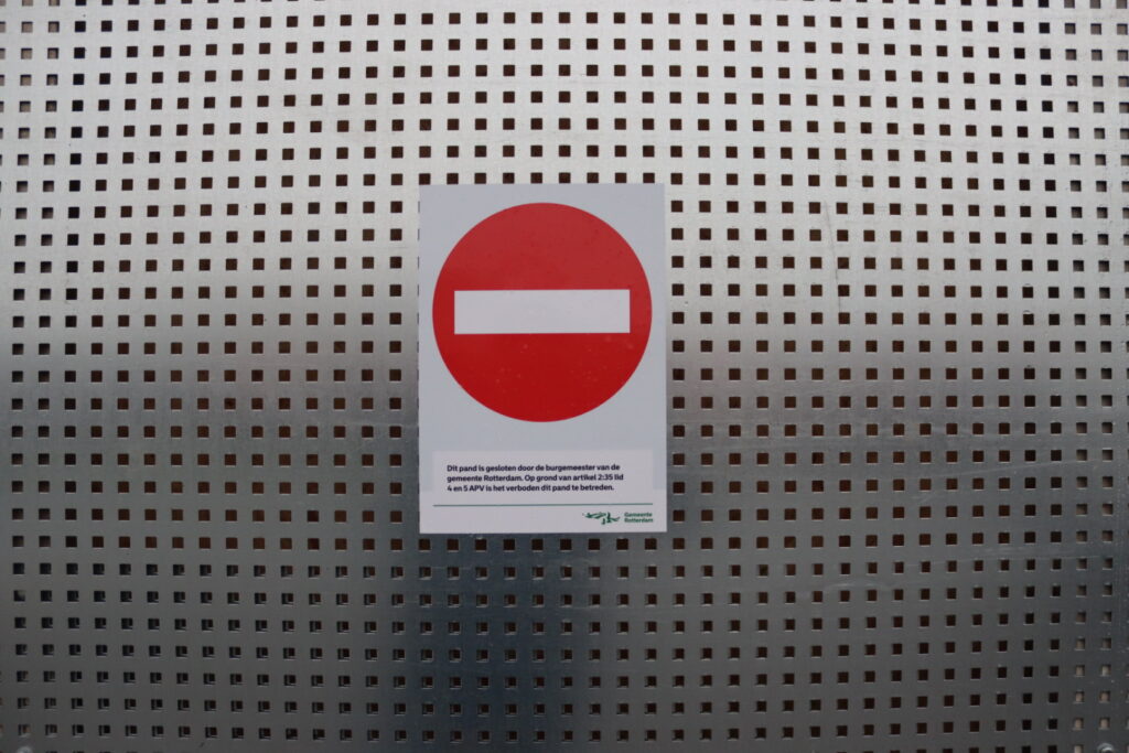 Er hangt een papier met de tekst ” Dit pand is gesloten door de burgemeester van de gemeente Rotterdam. Op grond van artikel 2.35 lid 4 en 5 APV is het verboden dit pand te betreden.”