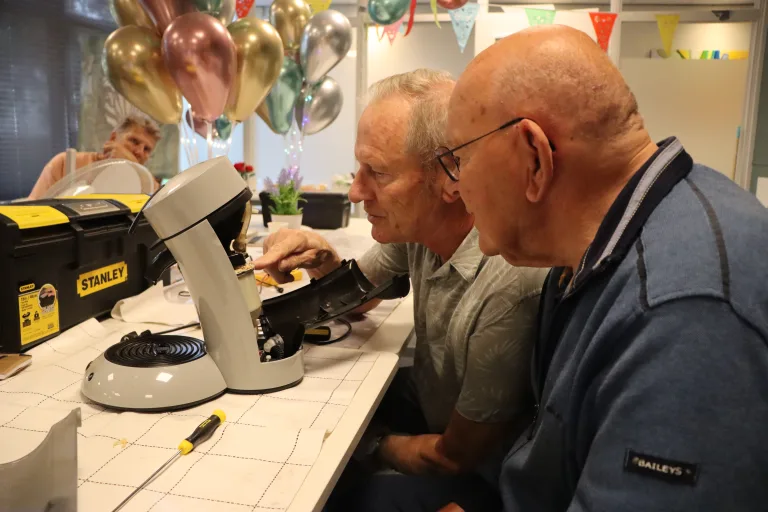 Als je koffiezetapparaat het niet meer doet of de ventilator niet meer aangaat, wat doe je dan? Vervangen is duur, en vaak kan het apparaat nog wel even mee. Duurzaam omgaan met spullen is natuurlijk niet nieuw. Het was Jan Zebel die 10 jaar geleden het Repair Café in Hoogvliet opende. Hij ging met 57 jaar met pensioen en zag zichzelf niet hele dagen thuiszitten. Na jaren op de wijkbus besloot Zebel, nadat hij had gehoord over een ander Repair Café, dat dit een goed idee zou zijn voor Hoogvliet. Afgelopen zaterdag 28 september vierden Zebel en de vrijwilligers in een feestelijke ruimte met slingers en ballonnen het 10-jarig bestaan.